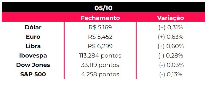 Entre as demais moedas, o euro teve alta de 0,63%, indo para R$ 5,452. Já a libra esterlina subiu 0,60%, cotada em R$ 6,299.